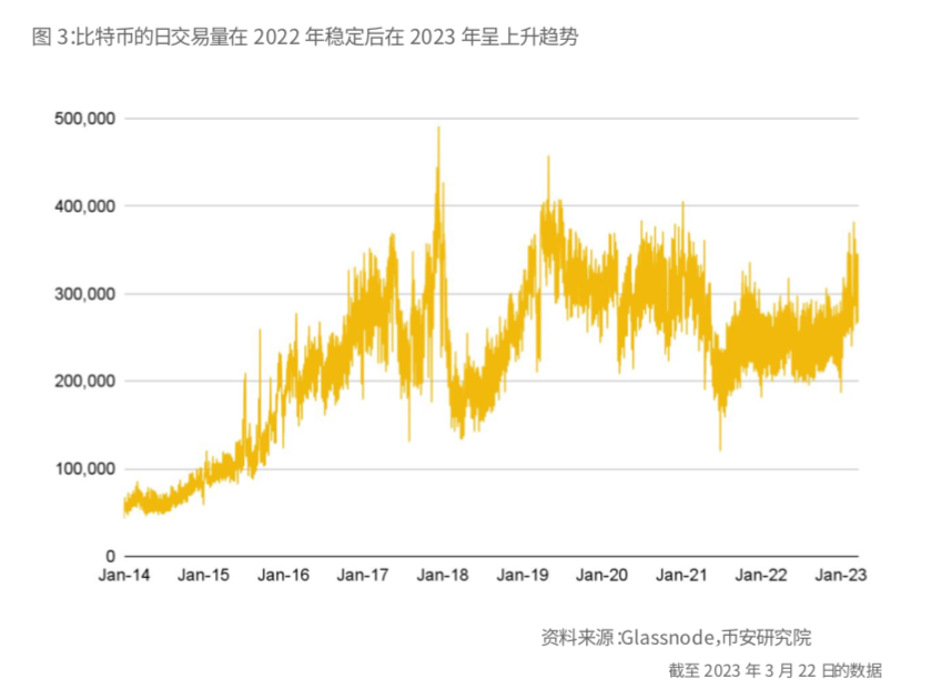 首先,让我们更仔细地看看比特币的每日交易数据。在从2021年牛市的高点(交易日数超过30万)有所缓和之后,在2022年的大部分时间里,交易活动保持在每天25万左右。这一趋势最近被打破,到2023年,每日交易量终于开始上升。每日交易量现在回到了300K以上 至少部分是由于序数和铭文给区块链带来的活动增加(在比特币的序数、铭文和NFT部分有更多探索)