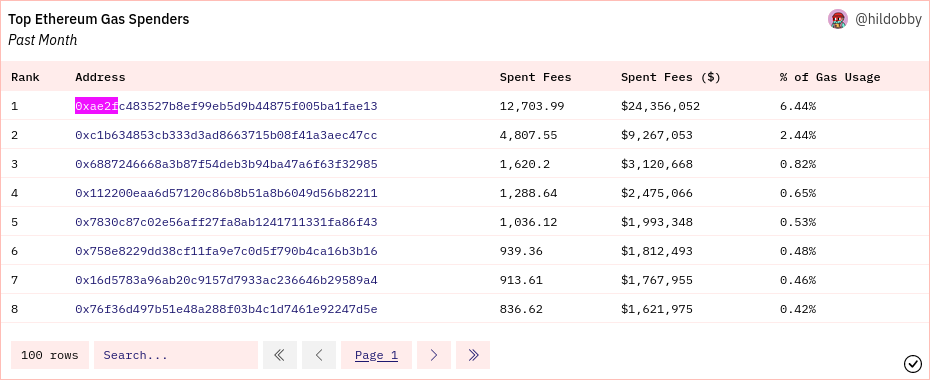在其运营过程中,这个 MEV 机器人在交易费用(gas)支出和利润产生方面展示了惊人的表现。令人印象深刻的是,这个机器人总共花费了惊人的 28,906,936.58 美元的交易费用。令人难以置信的是,尽管有大量的 gas 费用,MEV 机器人仍设法实现了约 250 万美元的可观利润。该机器人在一个月内消耗了所有以太坊Gas的6.4%。这种在Gas消耗方面的主导地位凸显了其运营的规模及其在以太坊生态系统中的深远影响。