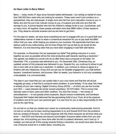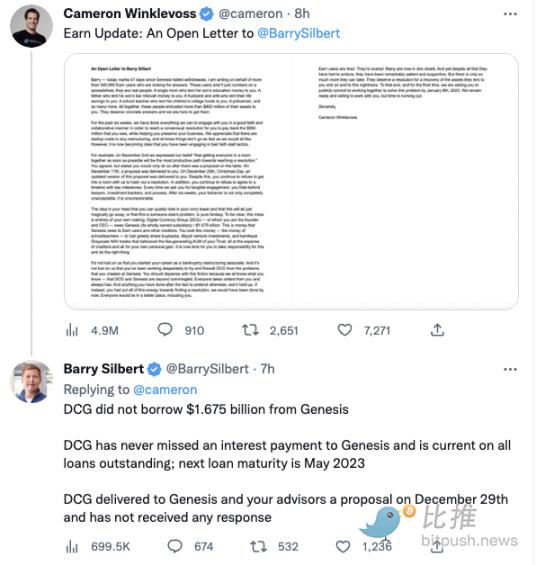 1 月 2 日,美国加密交易所 Gemini 联合创始人 Cameron Winklevoss 抛出一份公开信,指责 Digital Currency Group (DCG)首席执行官 Barry Silbert 采取“恶意拖延战术”,称 DCG 及其子公司 Genesis Global Capital 欠 Gemini 客户 9 亿美元,而且 DCG 内部资金管理“一团糟”,向 Genesis 借了约 16.75 亿美元用于集团内其他业务。信中称,Gemini 已经等待协商解决方案长达 6 周,但对方故意拖延流程,目前还没有给予任何回应。