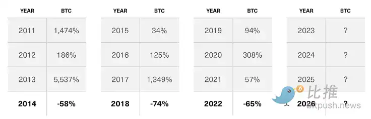 资料来源:Bitwise Asset Management。从 2011 年 1 月 1 日到 2022 年 12 月 31 日的数据,信息仅供参考。回报反映的是比特币本身的回报,而不是任何基金或账户的回报,也不包括任何费用。向后看的表现无法预测未来任何投资策略的表现。未来的加密货币周期可能不会长达四年; 四年增量基于历史数据,仅供说明之用,并非对未来结果的预测。本材料代表对特定时间市场环境的评估,并非对未来事件的预测,或对未来结果的保证。