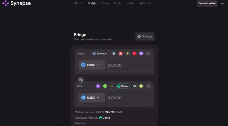 多链跨链协议,当前支持超过 18 个 EVM 和非 EVM 区块链,是 Canto 的重要跨链项目之一。Canto 是 Synapse 最新支持跨链的区块链,也是该协议首次进入 Cosmos 生态系统。官推表示,从 1 月 27 日到 30 日三天时间里,有超过 150 万美元资产通过 Synapse Protocol 转入 Canto;2 月 2 日 Synapse Canto 桥单日处理了 5 百万美金交易量。目前支持 SYN、NOTE、USDC 和 USDT 等少数资产跨链。