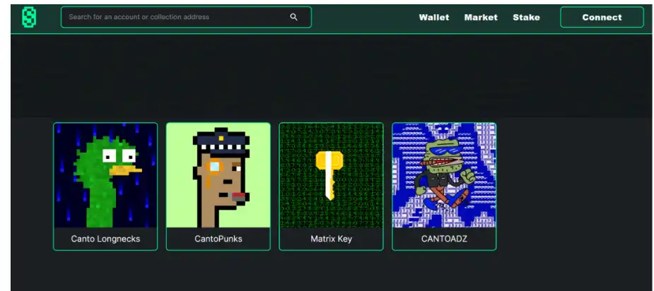 由 Cantoswap 创建的 NFT 交易市场,自称是 Canto 第一个也是排名第一的 NFT 市场。当前在该平台市场上有 Canto Longnecks、CantoPunks、Matrix Key、CANTOADZ 四个项目在销售,版税在近期由 10% 降低至 2.5% 。Providence 推出了 NFT 质押功能,持有 CantoPunks 的用户进行质押时每天将获得 10 个 MATRIX Token;当用户在拥有 CantoPunks 的同时拥有 Matrix Key 进行相互配对,每天产出的 MATRIX Token 奖励将会增加至 30 个。