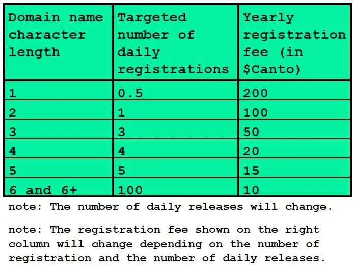 CANTO NAME SERVICE(CNS)即 CANTO 域名服务,于 2 月 1 日正式上线。用户可以通过拥有「.Canto」的域名表明属于「Canto 互联网社会」。官方还吸取了「ENS」、「.com」的域名炒作教训使用了反抢注价格机制,采用可变利率的渐进式荷兰拍卖(VRGDA,Variable Rate Gradual Dutch Auction)对 CNS 进行定价。