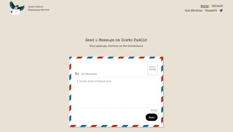 CPMS(Canto Public Messaging Service)由 CanToadzNFT 团队开发完成。这是一个类似于现实中传递信件/明信片的链上协议,旨在成为 Canto 链上所有消息传递和发送的中心。用户可以通过 CPMS「写信件」在链上传达信息给另一位用户,并附上邮票(一套邮票售价 10 CANTO)。此外,其还提供 Gas 加油站服务,用户通过购买官方的无供应上限 NFT(售价 50 CANTO)为加油站保持充足。用户最多可以在 CPMS Gas 加油站获取两次 Gas Fee 补充(3.3 CANTO 一次)。