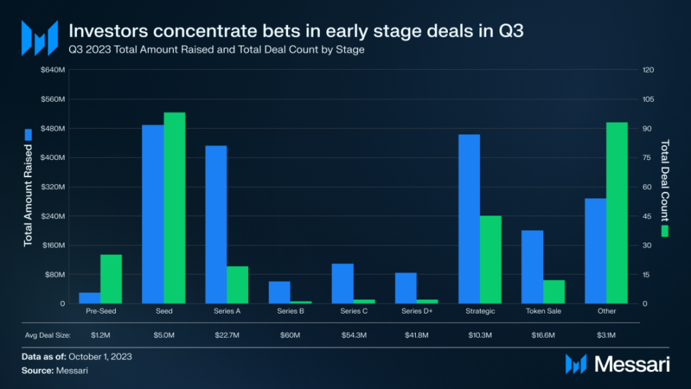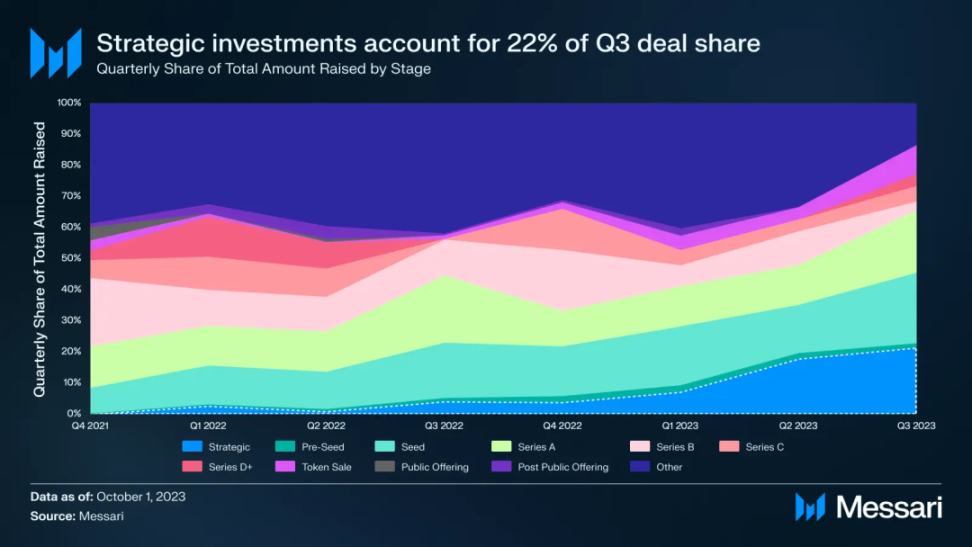 第三季度还有大量的战略性投资,其中企业和私募股权交易较为瞩目,例如对 Islamic Coin 的 2 亿美元投资。在整个熊市期间,战略性融资交易一直在稳步增加。在 2021 年 Q4 牛市的高峰期,战略轮融资仅占总融资额的 0.2%。2023 年第三季度,该占比上升至 22%,这表明严峻的市场条件正迫使项目筹集短期过渡资金,或最终被更大的项目收购。