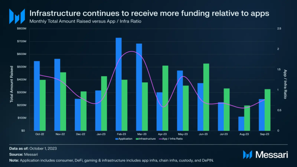 去年另一个显著的趋势是,与面向用户的应用程序相比,基础设施项目获得了更多的资金支持。通过将消费者、DeFi 和游戏领域归为「应用程序」类别,并将应用基础设施、公链基础设施、托管和 DePIN 领域分类到「基础设施」中,最好地证明了这一点。