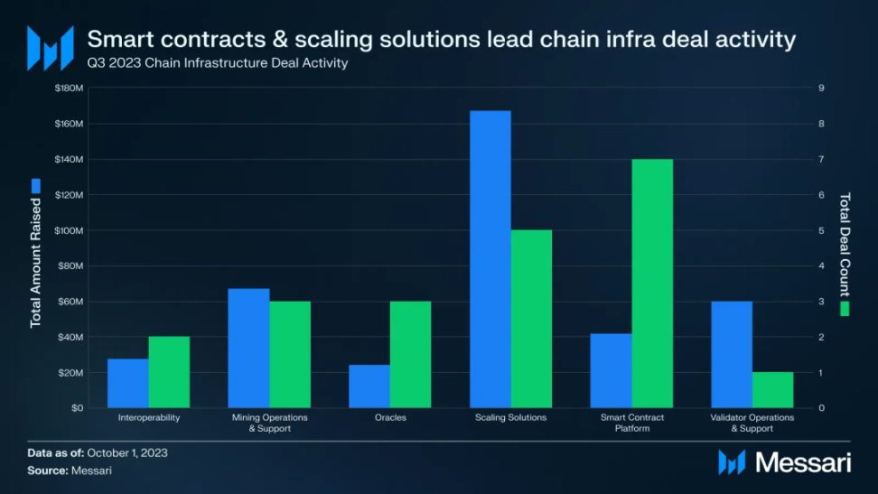 尽管只有 21 笔交易,但公链基础设施赛道在第三季度占据了最大的资金份额,其中三分之一的交易发生在智能合约平台子类别中。