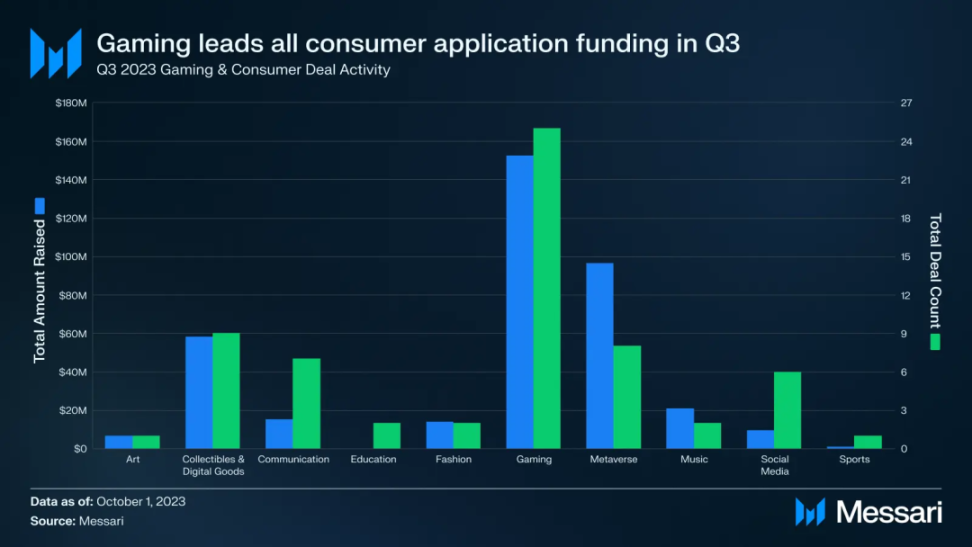 游戏领域最大的一笔交易是 Futureverse 的 5400 万美元 A 轮融资交易,Futureverse 是一个将人工智能和元宇宙世界相结合的平台。该领域内的其他元宇宙游戏项目,如 Mocaverse 和 Mahjong Meta,也在该季度获得了资金。Proof of Play 从主要投资方 a16z 和 Greenoaks 那里筹集了 3300 万美元的种子轮融资。