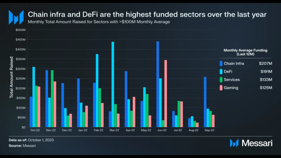 2023 年第三季度,加密行业融资的分配遵循过去 12 个月类似的模式。公链基础设施、DeFi 和游戏领域在此期间一直是融资最充足的领域。服务部门,包括营销、孵化器、安全和法律服务等业务功能,是过去 12 个月中唯一一个平均筹资超过 1 亿美元的领域。虽然其他领域对整个加密行业的发展也很重要,但这四个领域继续吸引大多数投资者的关注。