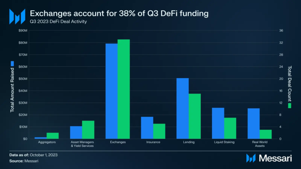 DeFi 是第三季度融资项目最多的领域,共有 68 笔交易。该领域内的投资高度集中,其中交易所类别占据了所有投资资本的 38%,共 33 笔交易。DeFi 项目总共筹集了 2.1 亿美元,平均交易规模为 300 万美元。