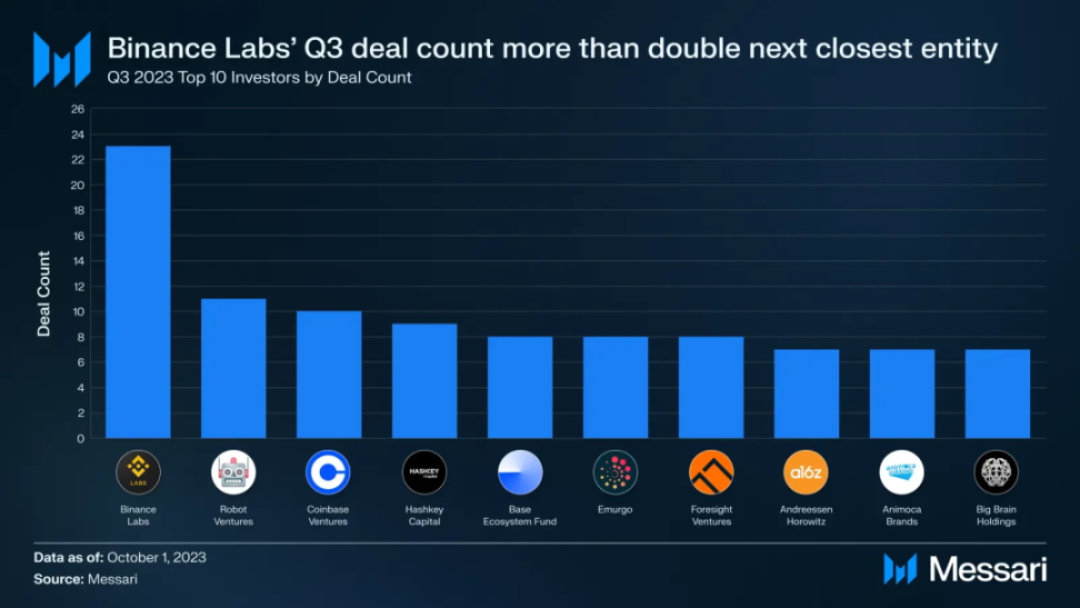 Binance Labs 是迄今为止最活跃的投资者。在第三季度,其参与的 23 笔交易超过了第二名投资者 Robot Ventures 的两倍以上。Binance Labs 在 2023 年一直积极投资,重点放在 DeFi 和游戏领域。此外,零知识和隐私技术的项目也是 Binance Labs 的投资目标。值得注意的是,Binance Labs 的 23 笔交易中有 12 笔是参与其加速器计划的项目。但即使这些项目被排除在外,Binance Labs 的其他 11 笔投资仍然使其在第三季度交易活动中与 Robot Ventures 并列。