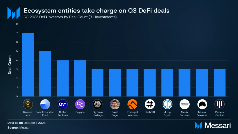 从第三季度交易数量来看,排名前四的 DeFi 投资者中有 3 个是生态系统实体。Binance Labs、Base 生态系统基金和 Polygon 共完成了 16 笔交易。