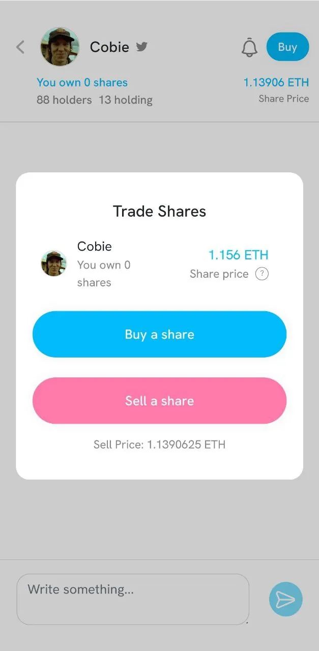 当你在 friend.tech 上购买他人帐户的股份时,你会自动获得与该帐户所有者及其其他利益相关者的私人聊天室的使用权。你还可以沿着应用程序的原生联合曲线系统对买到的股份进行销售,有时价格高于你最初买入的价格,有时则低于你最初买入的价格,具体取决于最近的交易活动。