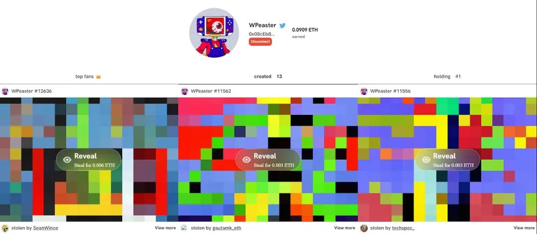 NFT 持有者可以 mint 隐藏的图像,其他人可以通过支付 ETH 来“窃取” NFT,从而获得并揭示该 NFT 的内容。