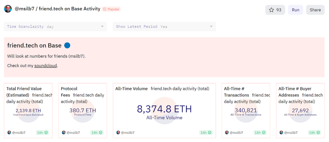 让我们来看一些数据:在 friend.tech 发布第一周,交易量已经超过 8,374 ETH。这意味着在过去的 7 天里,friend.tech 的交易量超过了除 DeGods(约 21,779 ETH)和 Bored Apes(约 8,515 ETH)这两个 NFT 系列之外的所有 NFT 系列。