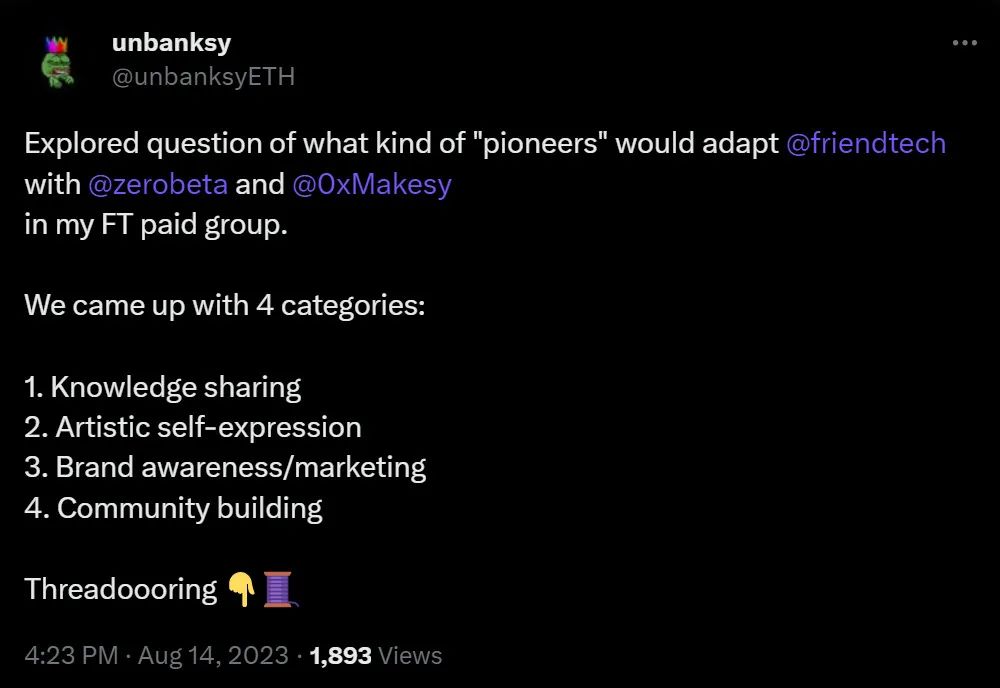 例如前面提到的@unbanksyETH 等人注意到,已经有多种不同类别的使用friend.tech 的方式,包括艺术自我表达、营销等。因此,即使在测试版中,加密艺术家也可以在聊天中通过文本分享“死忠粉独家 alpha 和 mint 链接”。