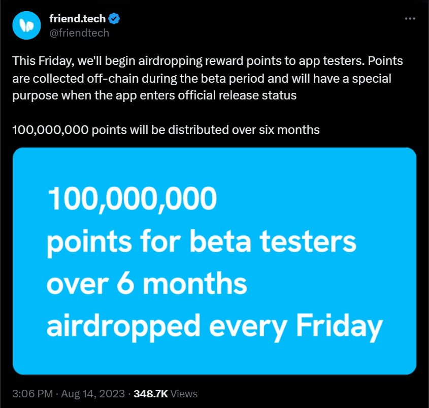 PSA:在平台正式发布前的六个月内,friend.tech 团队将“向应用测试人员空投奖励积分”。
