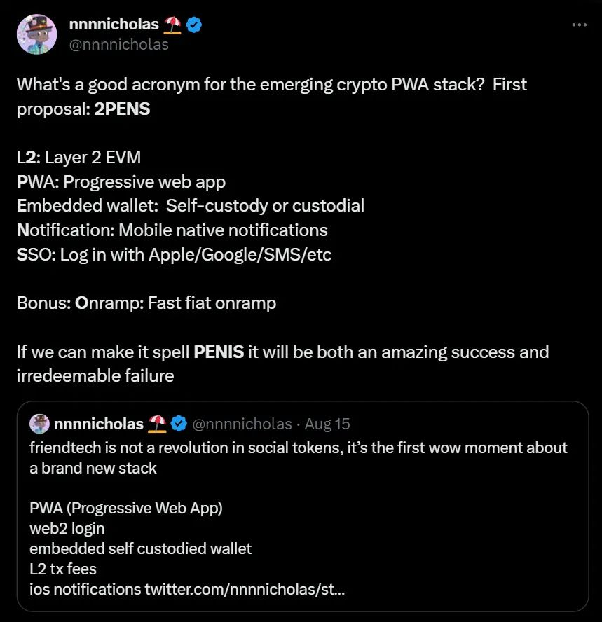 正如你在下图中看到的那样,friend.tech 以前所未见的方式将各种有趣的东西组合在一起。L2(便宜、快速的交易)、渐进式网络应用程序PWA(绕过集中式应用程序商店)、嵌入式钱包(用于降低入门门槛)等。