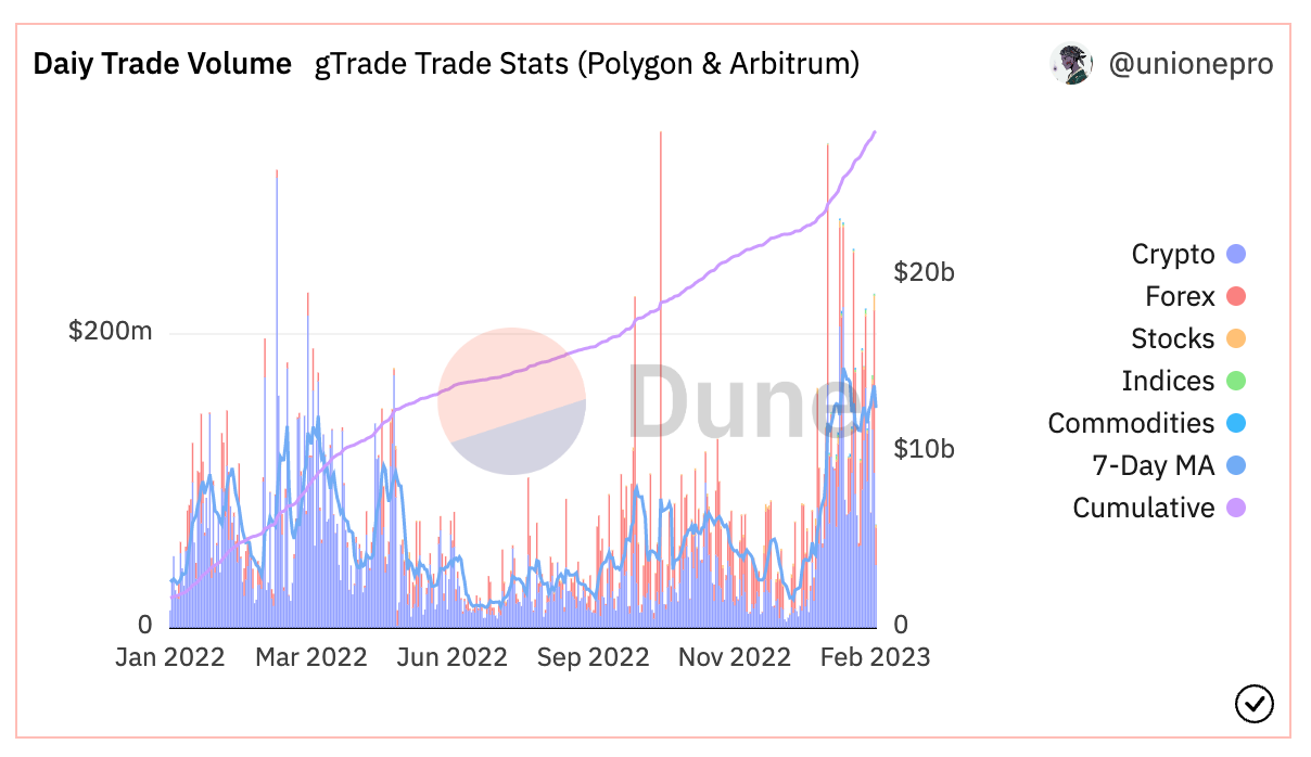 实际就在陷入困境后的 6月,前文所描述的交易侧三重风控机制就已经悉数上限,使其恢复了正常运营,并在9月 开始捕获到了当时外币对美元大贬值的热点,使其重回大众视野。在12月初,gDAI 上限,月底更是部署到了 Arbitrum,带来了今年初无论是币价还是业务数据的爆发。高效率的团队让 GNS 不断进化才有了如此凤凰涅槃之象。