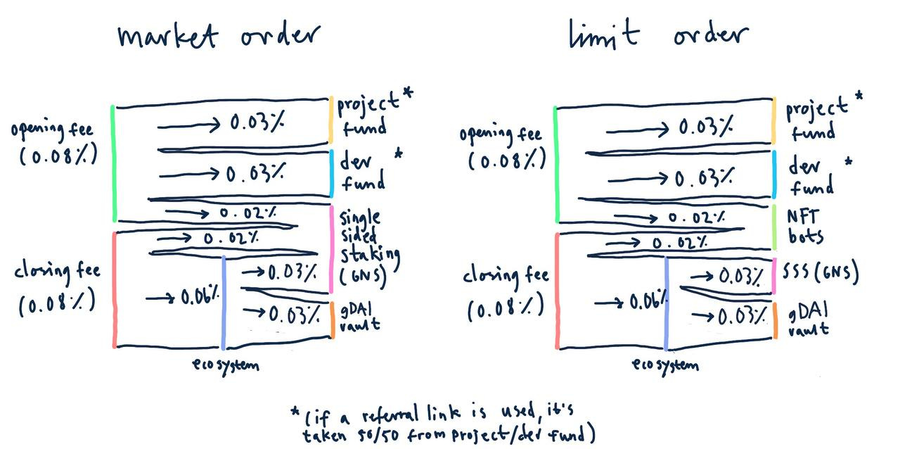 GNS 的费用去向明细如下图,考虑到市价单约占比 70%,因此 GNS Staking 分成约为 0.07/0.16x70%+0.03/0.16x70% = 36.25%, gDAI 分成约为 0.03/0.16 = 18.75% 。其中限价单中支付给 NFT Bots (执行机器人) 的部分即是上一条推文中进入 gDAI Buffer 的部分。