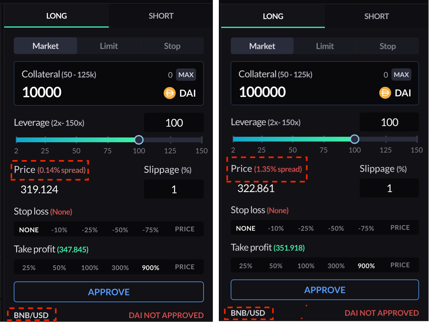 - Spread: 额外的开仓费用,开仓头寸越大,资产流动性越差,费用就越高。用于预防价格攻击,便于上架小币种。