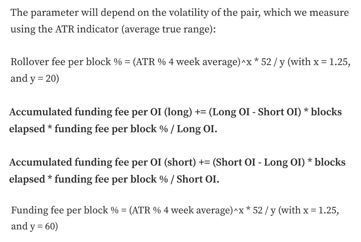 Rollover Fee / Funding Fee 根据近期波动性计算, Rollover Fee多空均要缴纳,而 Fung Fee 则由多空比例决定由一方支付给另一方,具体公式参见下图。在狂暴大牛市下,波动性和多空比的加大将会让多方支付的费用快速上涨,以此回补作为对手方的损失以及控制多空比。当然,这些也造成了其不菲的交易成本,所以在加密货币这种可以做 Index Asset LP 的资产类别上,体量会逊于GMX。而对于股票/外汇这种没有链上资产的类别,其就极具优势。