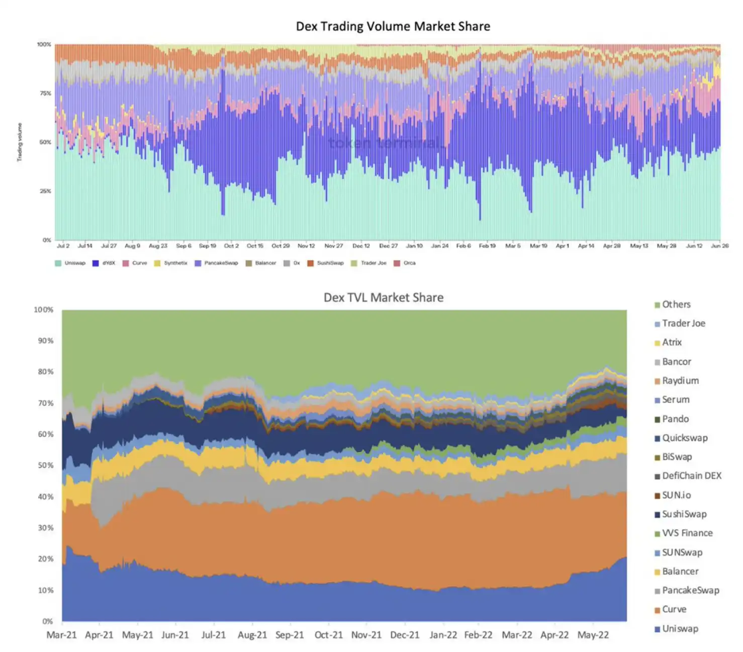 即便我们不考虑现状,展望 DAO 的未来,或许大部分项目也未必能有足够多的其他资产存储在 Treasury 中。这可能与 crypto 行业自身属性有关系。由于 crypto 行业是跨全球发展,各国之间的监管没有统一甚至还没有出现,让 crypto 行业出现了马太效应极强的局面。这种现象在现阶段 DeFi 中最成熟的去中心化交易平台(DEX)和借贷行业(lending)表现较为明显。之所以有这样的局面出现,是因为 crypto 市场是链接全球流动性的且监管还不充分的一个市场。