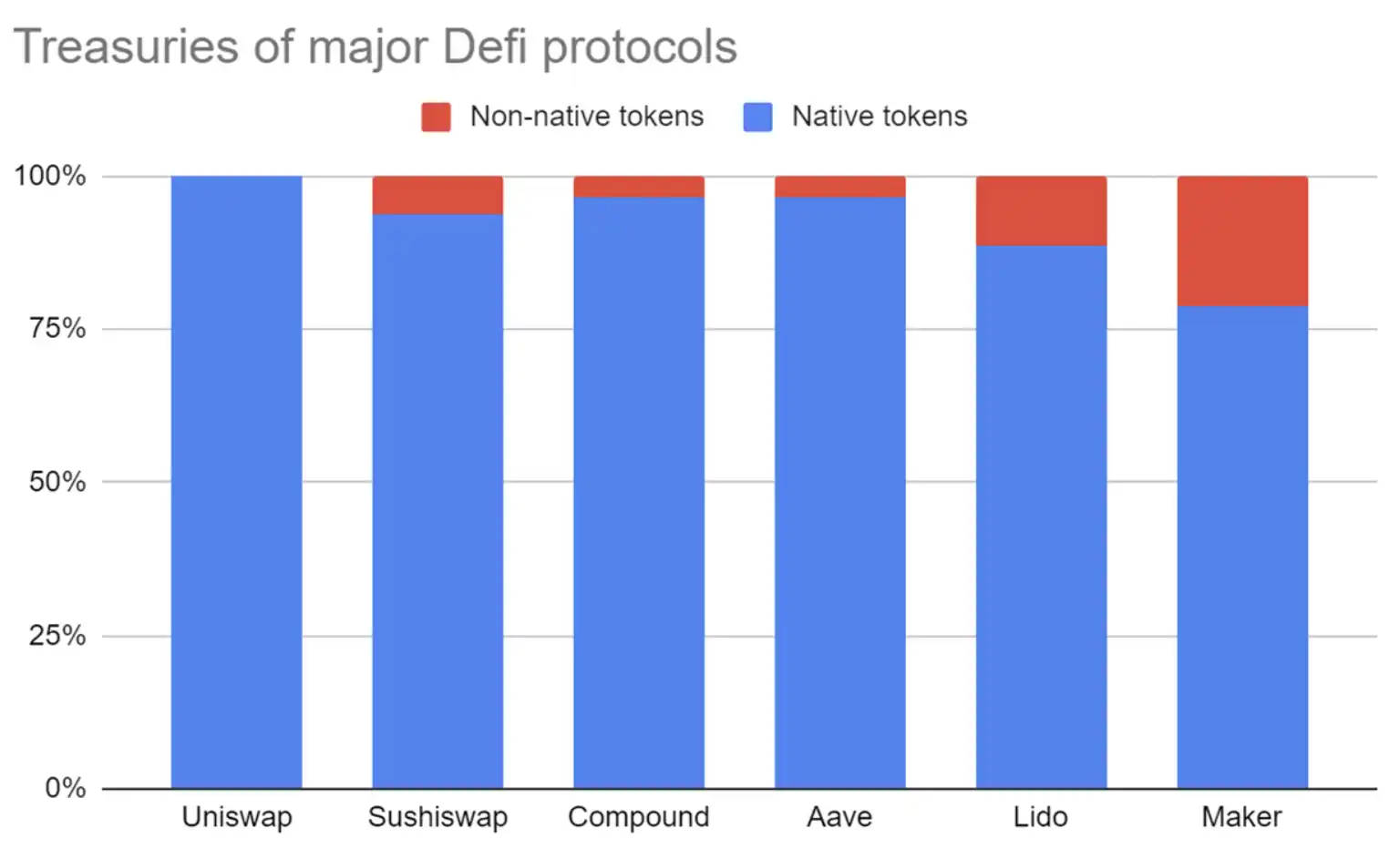 关于 DAO Treasuy 财务管理的叙事,市场中的讨论也非常多。但是,Hasu在 2021 年就分析了当时 Treasury 中资金的分布情况。大部分资产是项目自身的 token。而即便放到现在看,优质项目,比如Lido、MakerDAOtreasury 中仍然是以自身的 token 为主。