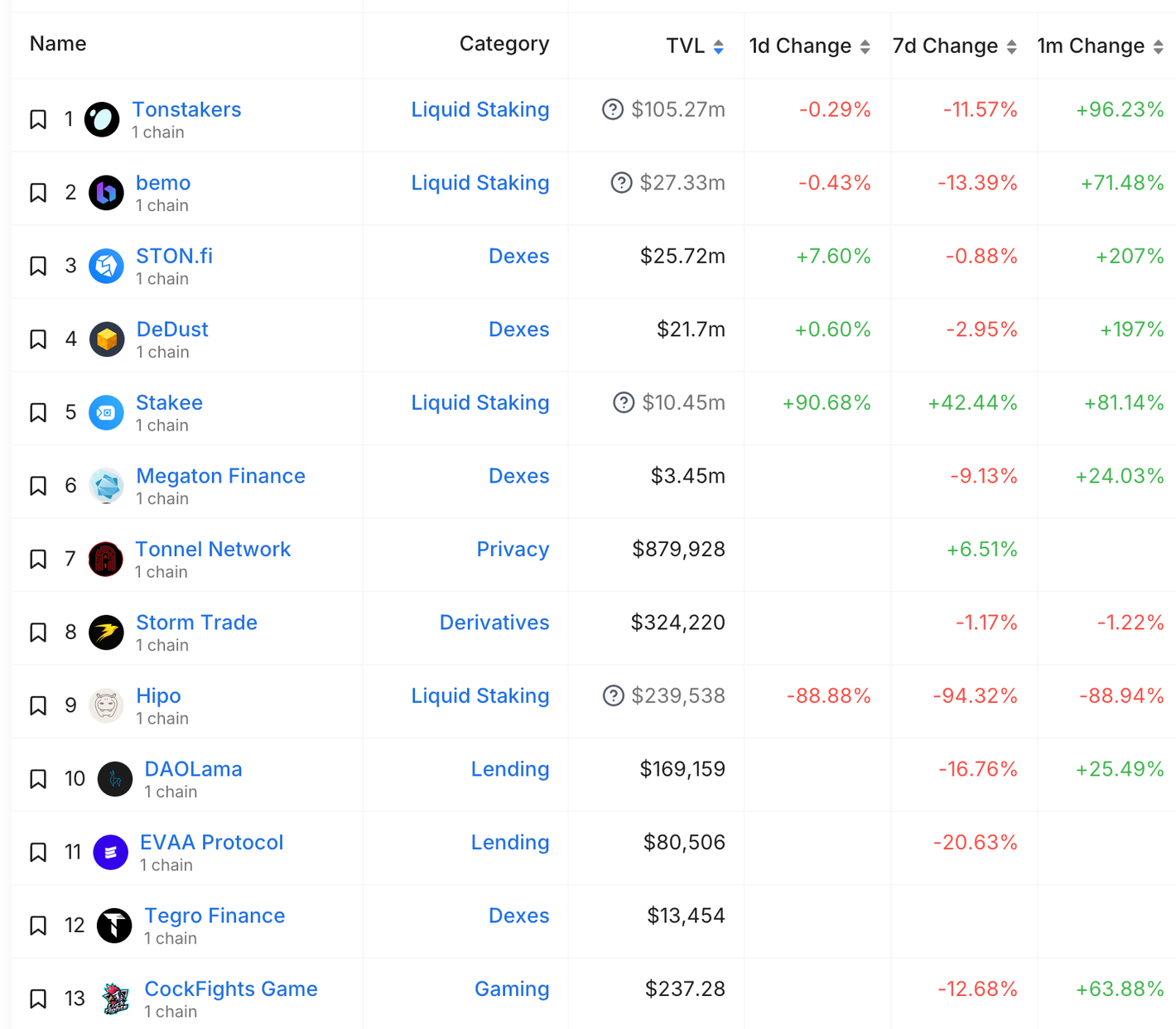 TON 的链上 TVL 为 $5343 万美金,有 13 个项目被 DefiLlama 收录,其中 TVL 排名最高的是 Tonstakers($1.05亿美金)与 Bemo($2733万美金),可以看出 TON 生态缺乏爆款 DeFi 项目,其中一个原因是现有 DeFi 项目,支持的 stake 资产单一且收益率较低,如 TVL 最高的 Tonstakers 目前仅能质押 $TON,APY 为 4.64%。