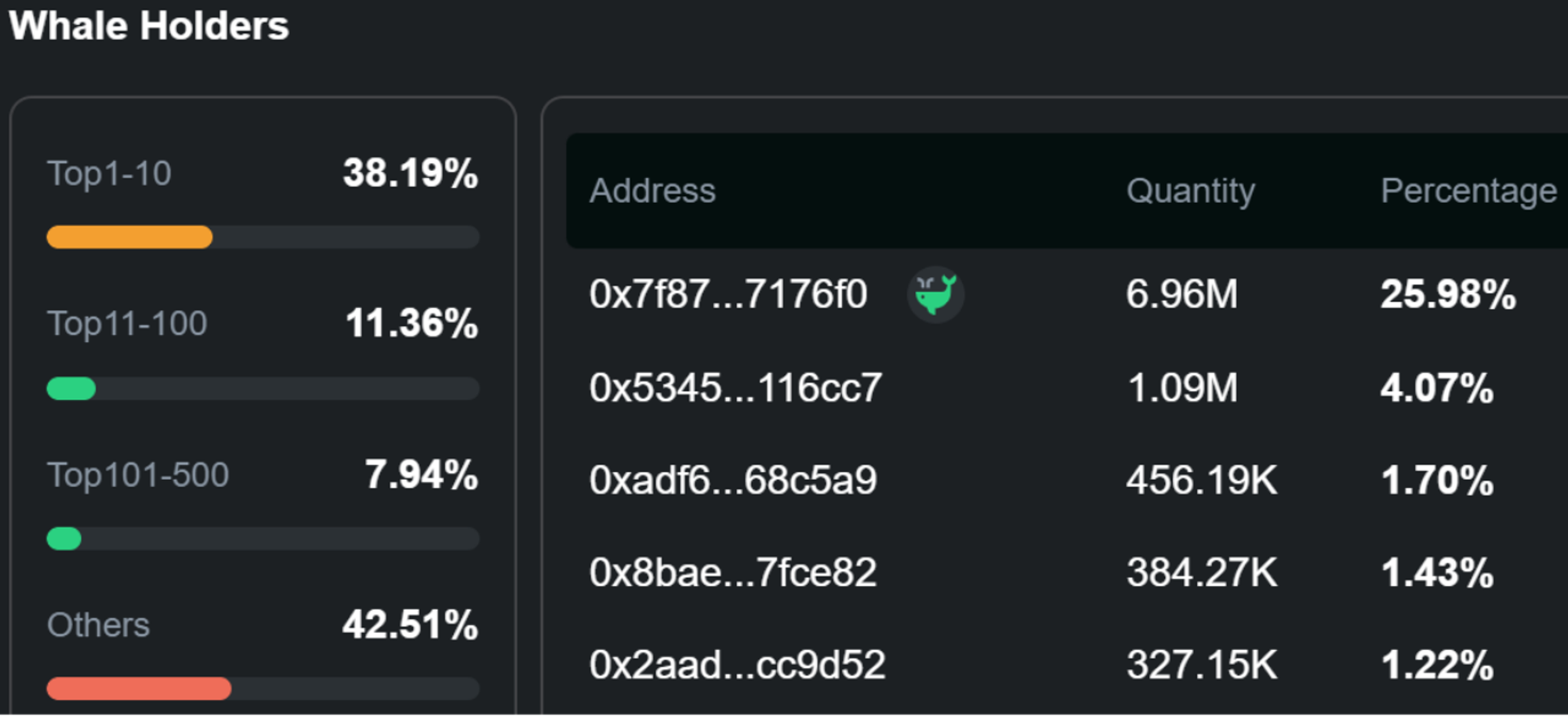 截至 2024 年 3 月 20 日,$TON 总供应量为 51.04 亿枚,流通量为 34.69 亿枚,币价为 $3.8/枚,FDV为 $192.76 亿美元,Market Cap 为 $131.01 亿美元,排名第 13,目前已上Bybit、OKX、Kucoin、Bitget 等CEX,已上币安合约。$TON 也成为了目前未上币安现货的排名最高的代币。假以时日,若 TON 的知名度和用户流量能够得到爆发式的增长,那么 $TON 也会成为币安优先考虑的上币的不二选择。从筹码分布来看,前十大钱包持币数量占据 $TON 总量的38%,前 100 钱包的持币数量占据 $TON 总量的 49%,代币分布较分散,避免了被大量投资机构和项目方持有而存在的潜在抛压。并且 Ton 还推出了 TON Believers Fund,共锁定逾 13.17 亿枚 $TON(约占总供应量的25%)。TON Believers Fund 允许任何 $TON 持有者将其代币捐赠或锁定 5 年:2 年锁定期和 3 年归属期,从第 3 年开始将会把捐赠的代币奖励给所有存款人。据目前的公开消息显示,已有 10.54% 的代币在 2022 年由社区捐赠给 TON Foundation。
