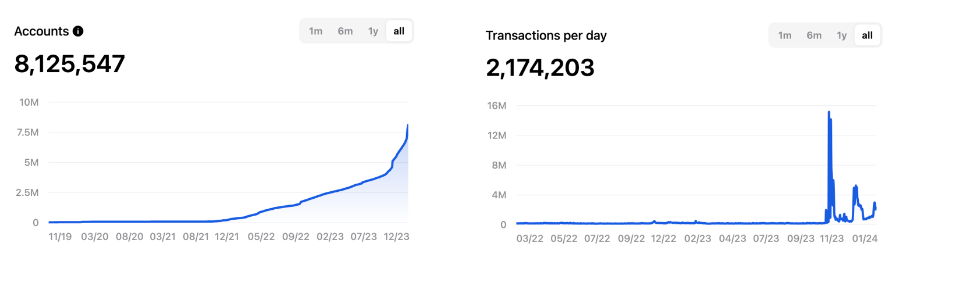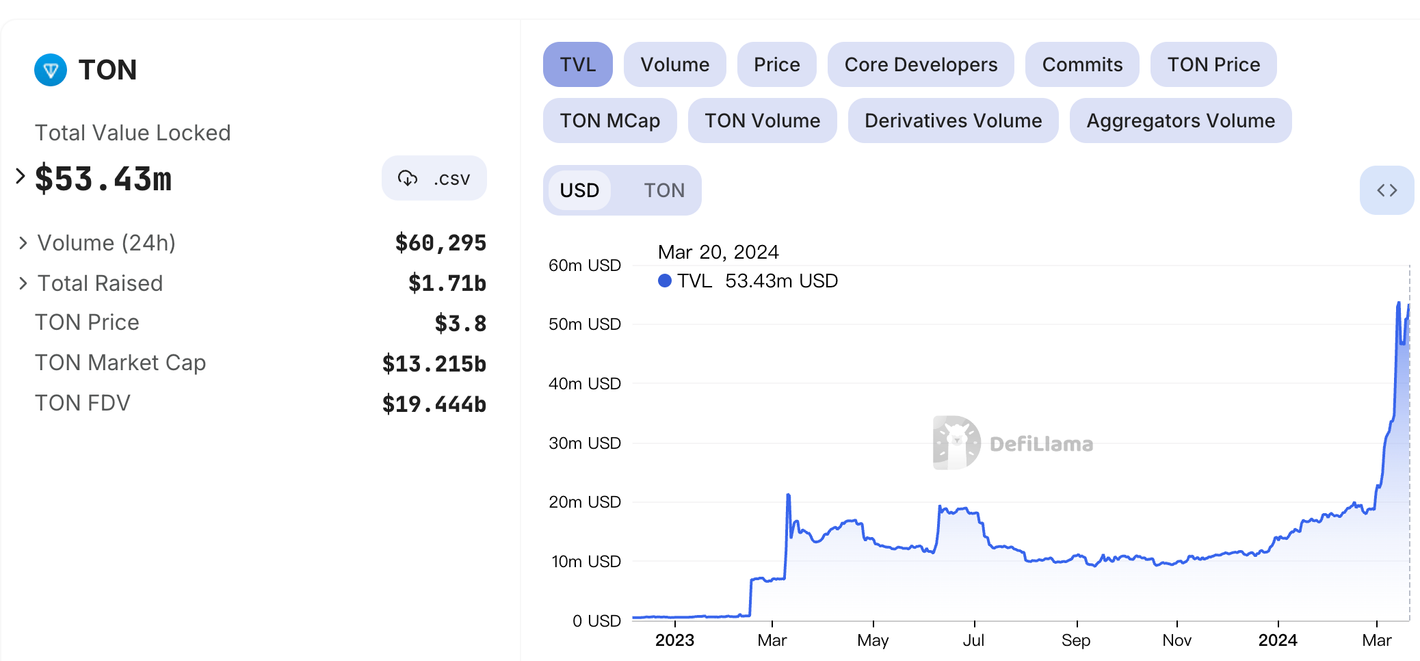 TON 的目标是提供易于使用的工具和可靠稳定的基础设施,以使 massive adoption 变得更加容易。尽管 TON 在 2021 年就已上线交易所,并随后推出了 TON 支付、存储、DNS、跨链桥(官方桥支持 TON/ETH 和 BSC)等基础设施与功能,但 TON 真正引起广泛关注却是去年 7 月 Unibot 和 Bananagun 等 Telegram Bot 的热潮,而在 9 月的 Token 2049 活动中 Telegram 更是官宣与 TON 的正式合作并推出了自托管加密钱包 TON Space,更是将 TON 推向了高潮。至此 TON 币价从 去年8 月的 $1.2 上涨至 $3.8(涨幅215%),市值挤进前二十,成为之前熊市中一匹亮眼的黑马。现在,尽管 TON 的热度有所降低,但是作为 Telegram 官方支持的唯一的公链,背靠 Telegram 背后 9 亿活跃用户,TON 将在一众现有公链卷性能(TPS)、卷 MEV 兼容、卷叙事的背景下,从支付、社交,小程序等角度展开一场完全与众不同的叙事。