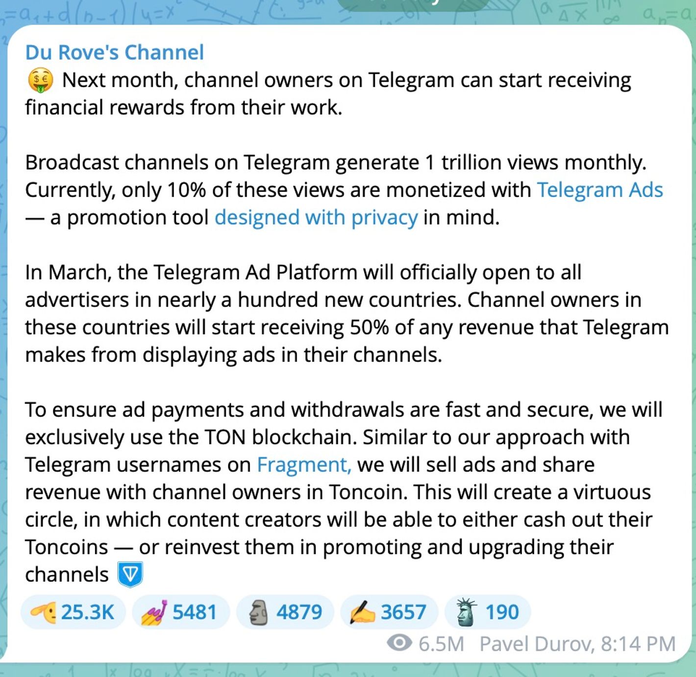 官方表示,为了确保广告支付和提款的快速和安全,将专门使用 TON 区块链,官方将与频道所有者分享收入,这将创造一个良性循环,内容创作者将能够兑现他们的 Toncoin,或者将其重新投资以推广和升级他们的频道。