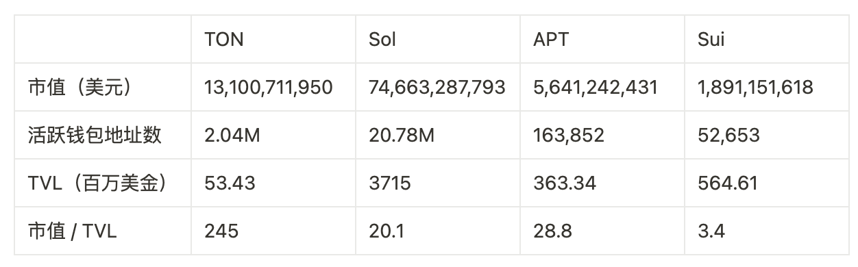 快速更迭的 Telegram 在吸引和容纳了大量真实用户后,也在开拓更丰富的功能与 Dapp 以留住用户,试图完成从通讯协议到社交平台再到超级应用平台的升级。其自由宽松的氛围以及愈来愈丰富的 Dapps 与服务势必将吸引更多的用户;叠加 Telegram 是 Crypto 的“重要阵地”,Telegram 唯一支持的区块链 TON 必将从中受益。正如 TON Foundation 所称,期望在 2028 年使 Telegram 的 30% 活跃用户加入 TON,按此计算届时将有 5 亿 Telegramy 用户 将会成为 Ton 链的使用者。因此,我们觉得目前 TON 需要考虑的首要问题是如何将 Telegram 用户引流到 TON。除了不断建设不同类别的 Dapps 来满足 Telegram 引进来的流量,更可以借助 TON 钱包将游戏、DeFi、创作者经济、加密电商等融入高频的生活场景中,以此提升用户使用 TON 的频率和粘度。除此之外,TON 更需要在 Telegram 上进行更大力度更广范围的宣传推广。而从投资的角度看,目前 $TON 币价 $3.8/枚,市值 131亿,排名 13。目前 Ton 的市值已经较高,市值超过了 Apt、Sui 等公链,投资人如果想要获得 5-10 倍的投资回报可能需要等待大牛市的到来。TON半年前价格为2.48,现价为3.8。Aptos半年前价格为5.2,现价为14.4。Solana半年前价格为20,现价为166。Sui半年前价格为0.45,现价为1.52。可以看出TON的半年内涨幅并不大,还有潜力空间。