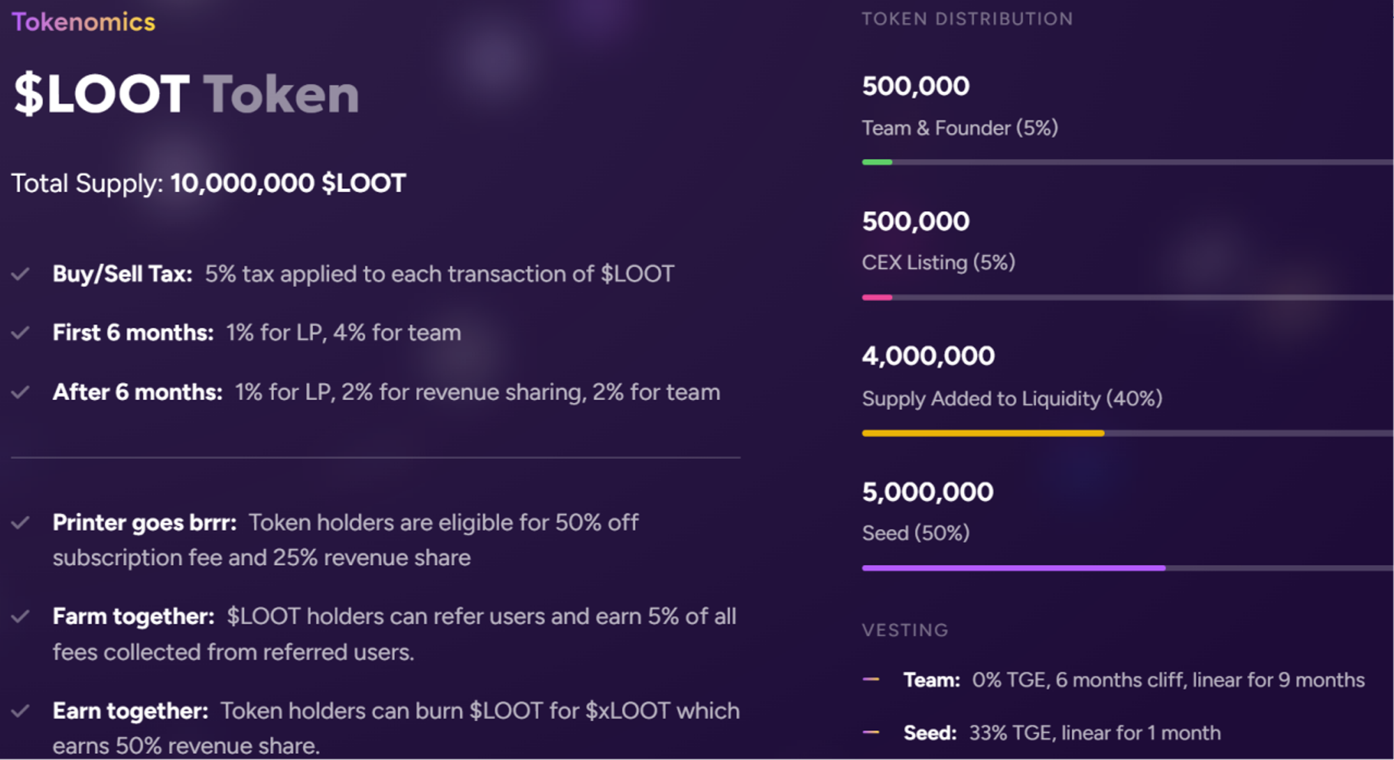 Lootbot 注意专注于自动化空投交互,能够筛选出最有利的空投机会,并同时实施强大的安全措施,以保护用户免受黑客和欺诈活动的侵害。目前已支持 ZkSync、Layerzero、Linea、Base、Taiko 与 Polygon 链。在 Lootbot 上进行的前 15 笔交易是免费的,之后会建议用户花 $30 美金/月购买其 Premium 版本。目前 Lootbot 已收到 $14.8万 subscription费,$LOOT 持有人可选择燃烧 $LOOT 来铸造 $xLOOT 来获得收益,目前共有 198 万枚 loot 被销毁。