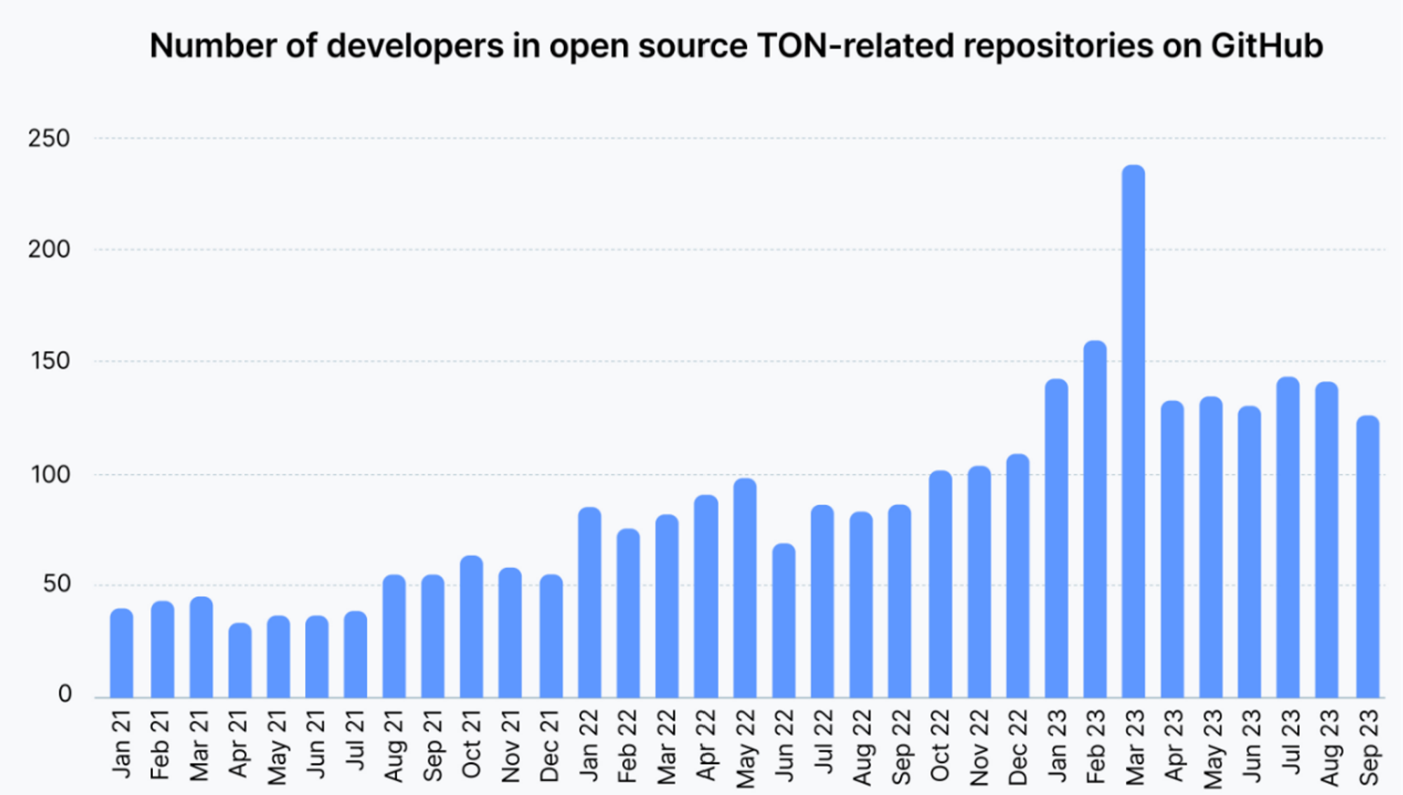 截至去年 9 月底,Telegram 上的 TON 开发者社区成员共有 10747 名,GitHub上有 176 名活跃开发者,比较出名的开发团队有 TonWhales、Orbs 和 TON Tech。为吸引更多的项目团队来 TON 上开发,TON 社区除了提供 TON SDK、Ton Connect、 TACT 语言与 Blueprint 框架等基础工具,还提供 TON 区块链课程、TON TACT Challenge 来推广 TACT 语言、举办 Hack-a-TON x DWF x AWS 黑客松并提供超过 $415,000 美元的奖金池、设立 TON Grants 项目与 TON Bounties 项目等。TON Bounties 项目成功处理了超过 155 个提案,其中 40 个新的赏金任务在去年第三季度获得批准,目前已完成的 25 个项目获得了约 $53,000 美元的奖励;TON Grants 项目已受理 103 个项目申请,批准 10 个项目。除此之外,TON 还成立了 $2.5 亿美金的 TONcoin.Fund 来投资 TON 生态项目,投资主体覆盖 Infra、Defi、NFT、gaming、sociafi 等。