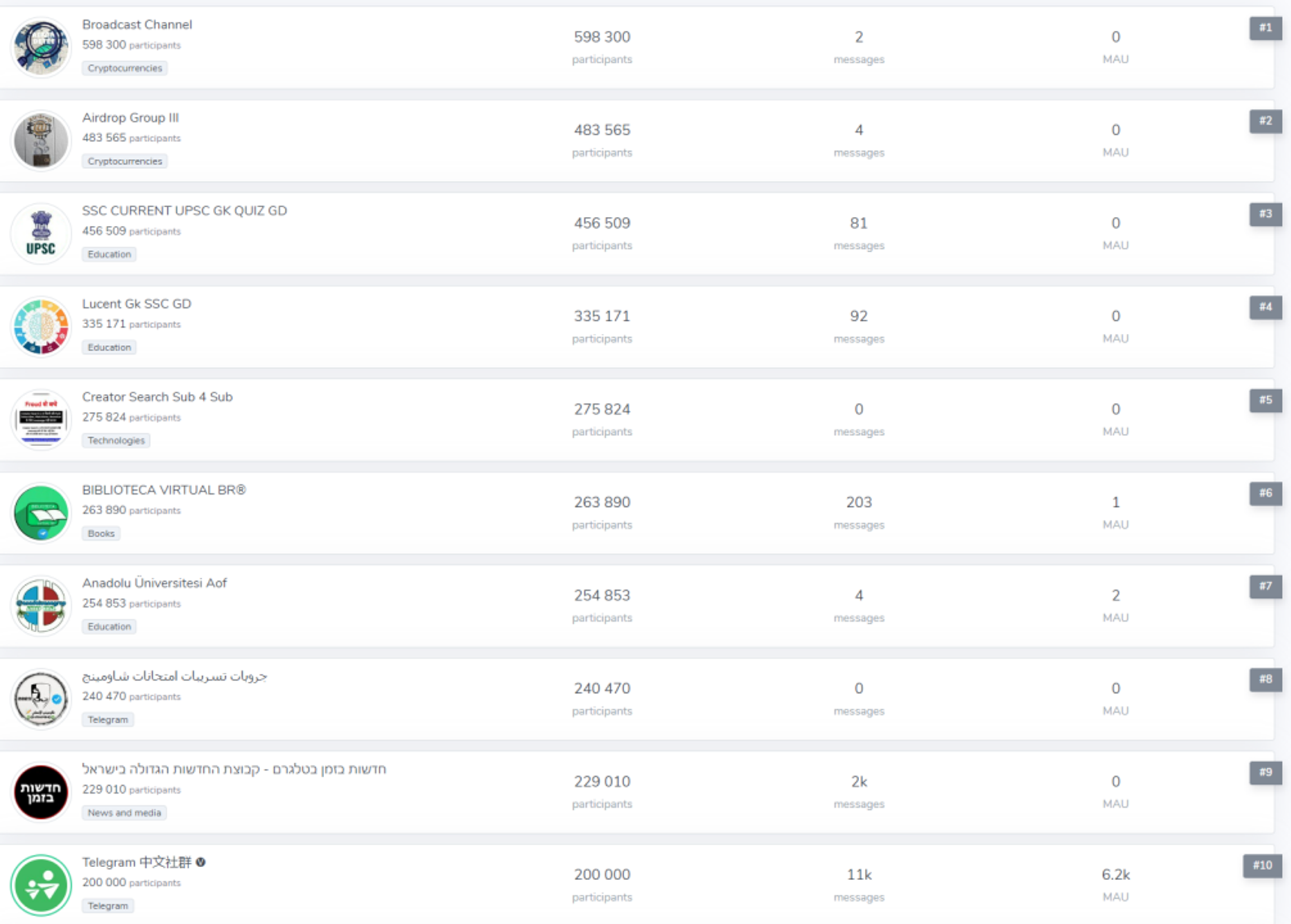 Telegram 是一个基于云的免费即时通讯软件,2013 年由 VK(俄罗斯主流社交媒体之一)创始人 Nikolai 和 Pavel Durov 创立。Telegram 坚持言论自由和保护隐私的主张吸引了全球众多用户, 其注册用户超过 13 亿,月活用户(MAU)近 8 亿。Telegram 宽松的言论氛围和监管环境使得 Telegram 成为了 Crypto 的“重要阵地”——几乎所有 Web 3.0/Crypto 项目都拥有 Telegram 社群,用于项目宣发、消息公布以及与社区互动。Telegram 社群的活跃度也成为了衡量项目营销能力的重要指标。并且 Telegram 上订阅数 / 会员数最多的 Channel 以及 Group,超过一半是与 Crypto 内容相关的(如下图所示,Telegram上最大的两个 Group 都是与 Crypro 相关的)。更重要的是,据 TON 中文频道统计 Telegram 拥有超过 37,000 个活跃的加密社区。