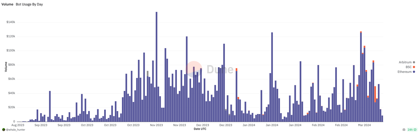 Telegram Mini Apps 与 Telegram 之间的桥接就是 Telegram Bot,从其“截至去年7月累计交易量已超过 1.9 亿美元,单日最高交易量达 1000 万美元”就可看出 Telegram Bot 赛道的火热以及其庞大的真实用户需求。从用户角度看,他们可以利用这种 Bot 来进行 DEX 交易、刷空投、跟进某个特定钱包的交易等操作。通过与 Telegram Bot 的交互,用户只需支付一定的费用就可以轻轻松松地在 Telegram 界面上提对接整个区块链。