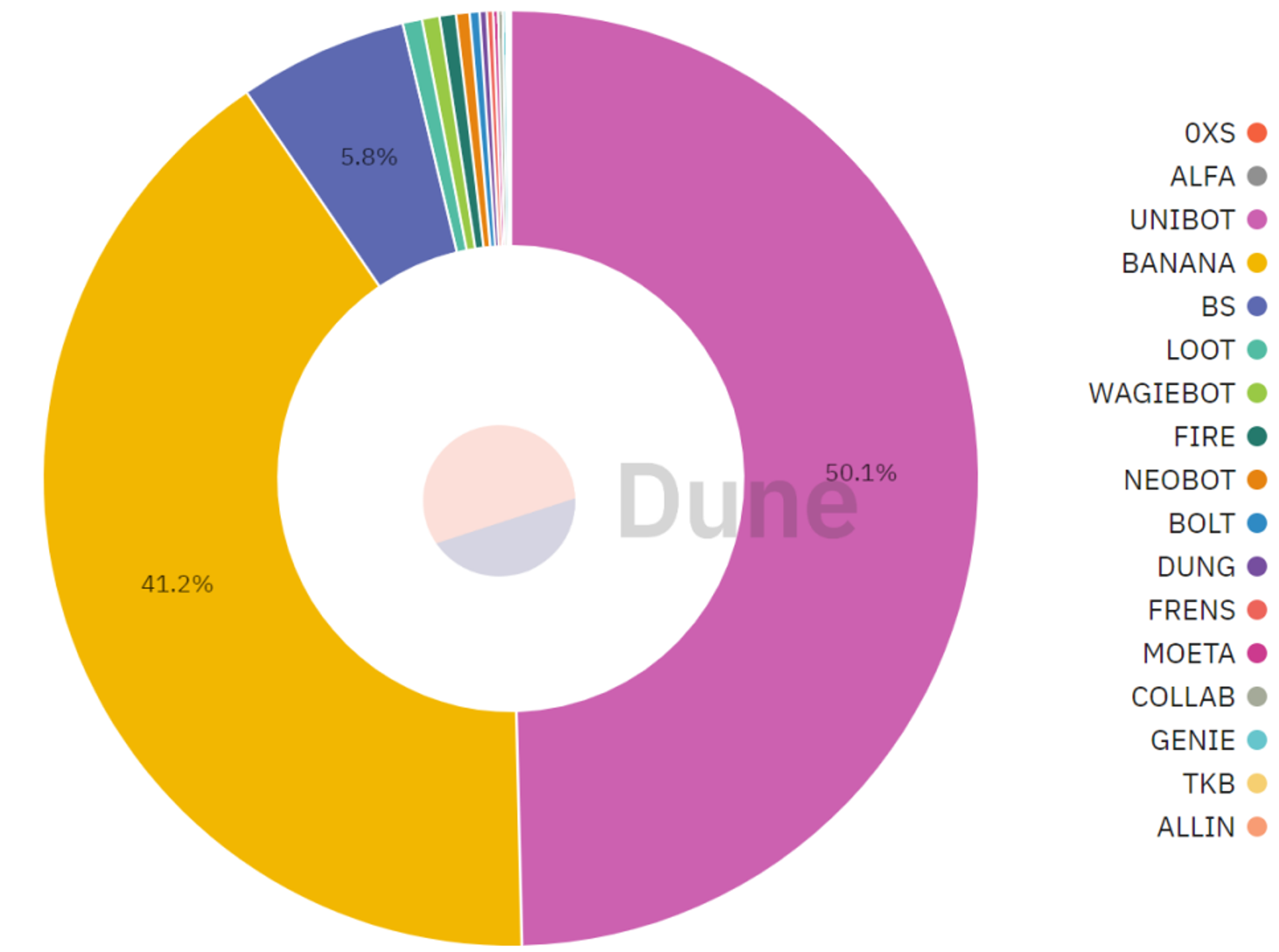 从 Dex 24 小时交易量来看,Unibot 与 Banana 占据了 Telegram Bot 赛道交易量的大部分,占比分别为 50% 与 41% ,目前仍处于项目竞逐市场份额阶段。 另外,根据 CertiK 研究分析近 40% 的 Telegram Bot 项目疑似处于休眠状态、可能存在欺诈现象,或面临无法从大幅抛售中恢复的风险。这可能的原因之一是 Bot 项目直接使用 TON 提供的 TACT 语言和 Blueprint 搭建,开发过程相对简单,易于复制市面上的成功项目,但是这些项目在推出后并不具备持续吸引用户的能力。因而投资者在关注 Bot 赛道项目时也要关注其风险。