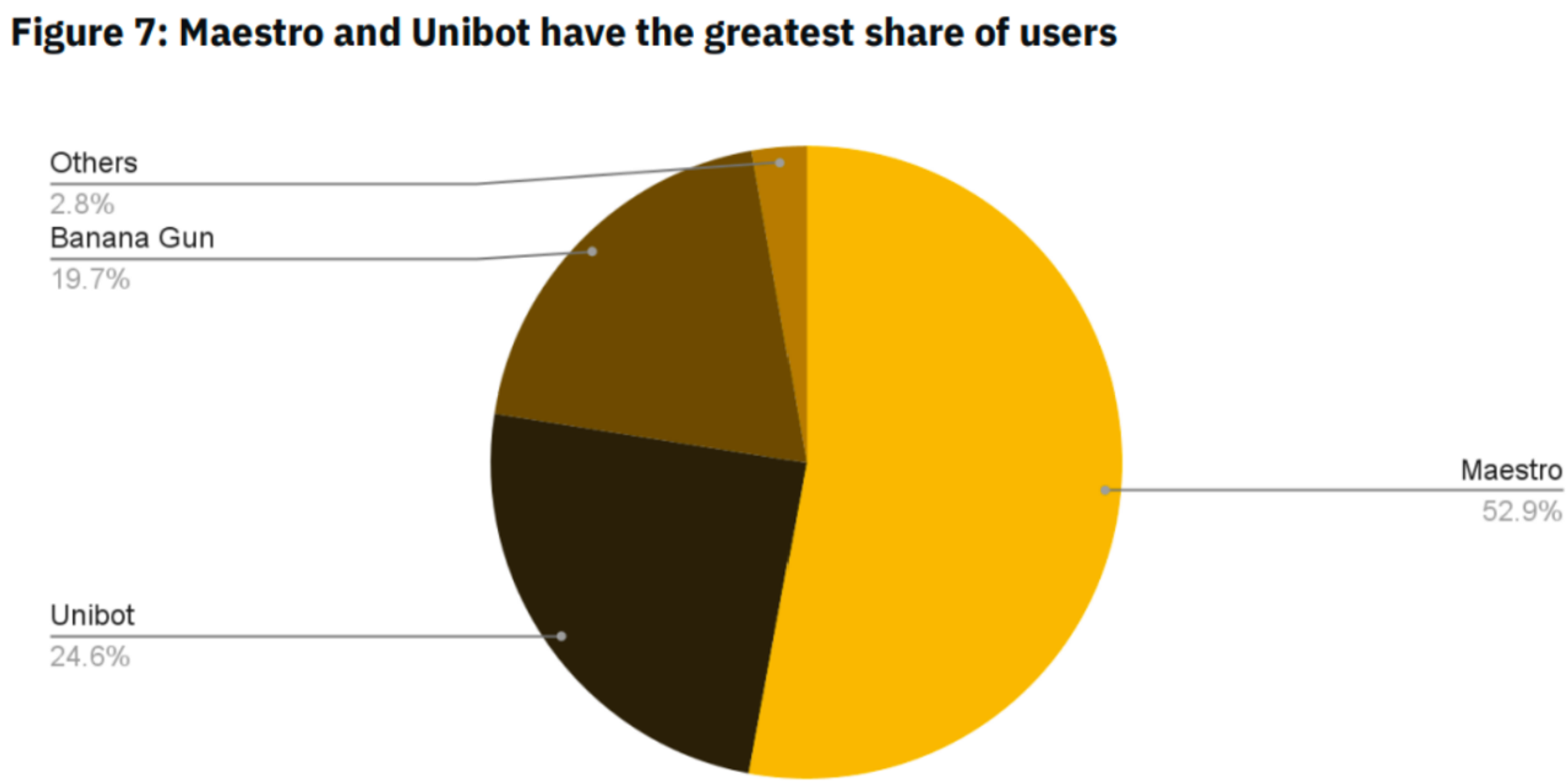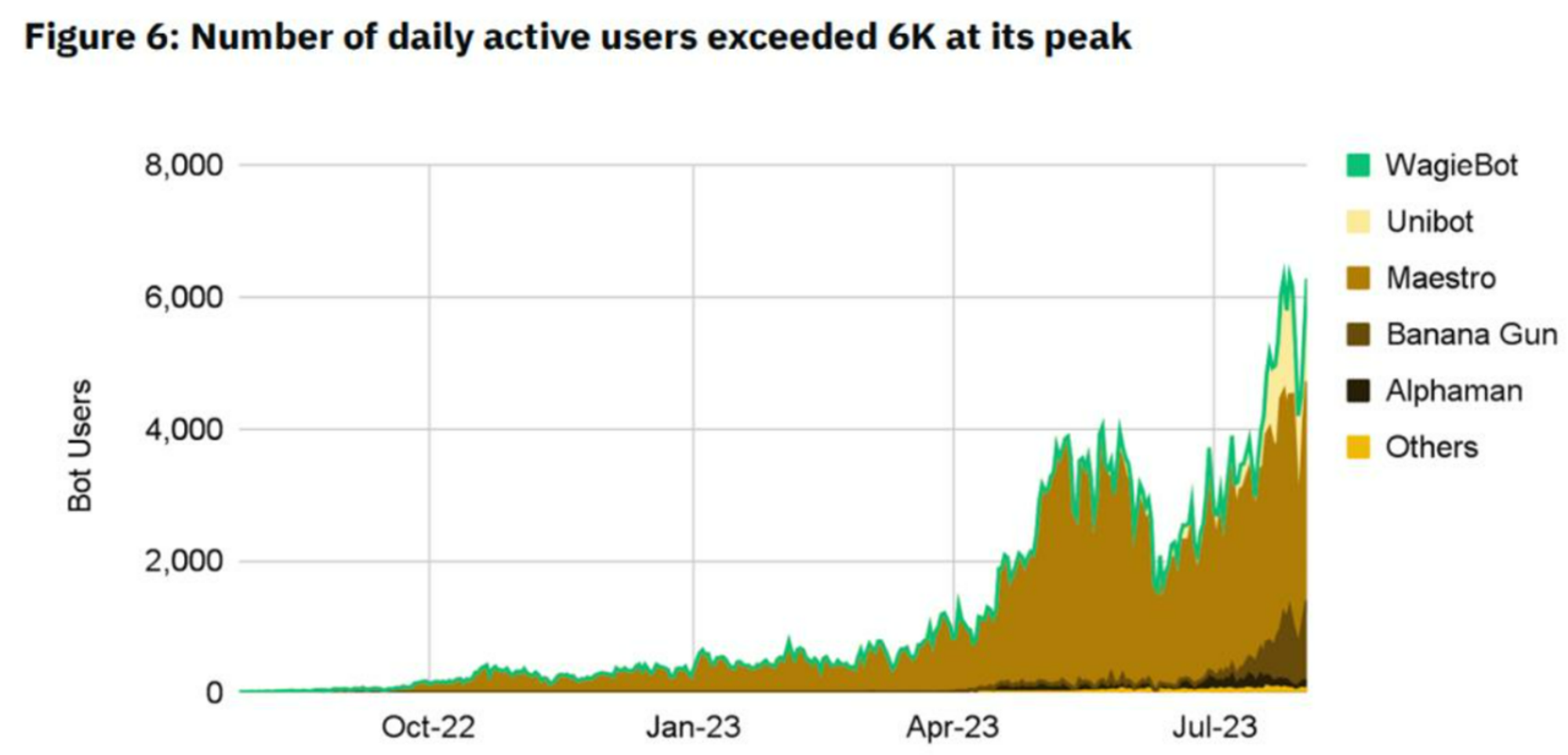 根据币安研报,Telegram Bot 每日日活用户数在去年7月达到高峰超过 6000,使用最多的是 Maestro(每日活跃用户约为 2000-3000 人)以及 Unibot (约 1700人)。