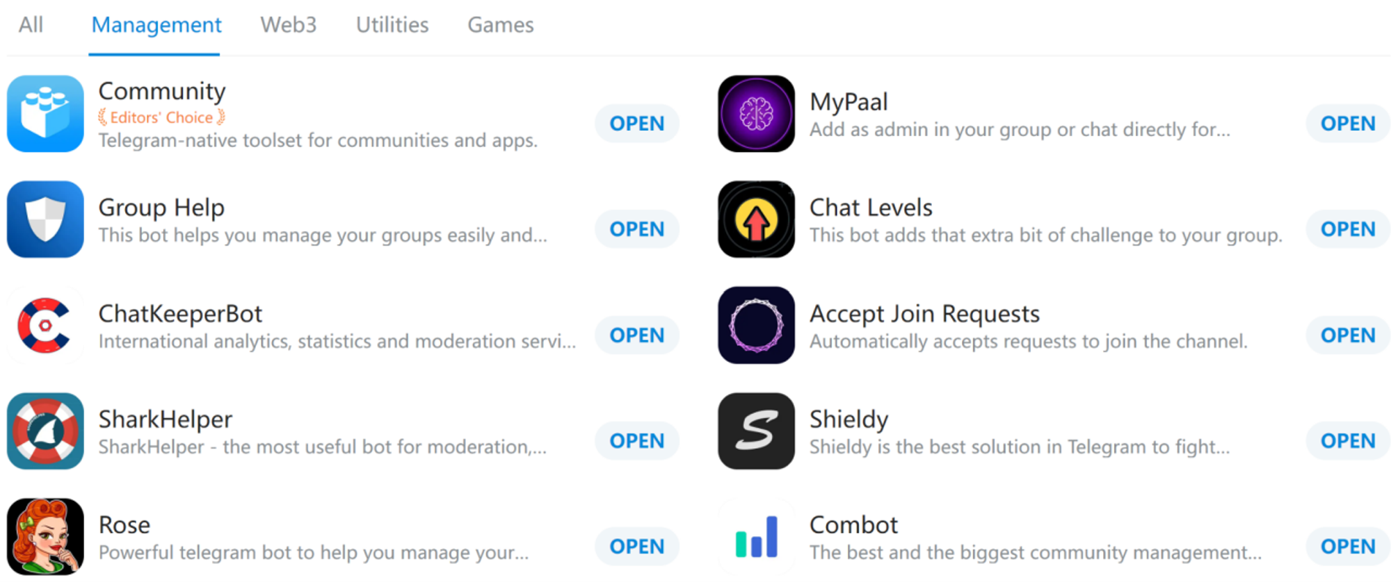 Telegram Mini Apps 是在 Telegram Messenger 内部运行的 Web 应用程序,由 TON Foundation 推出,旨在满足用户游戏、内容共享、生产力工具等需求,可以从 Telegram 聊天或群组对话中轻松访问它们。Telegram Mini Apps 包括机器人、游戏和网络应用程序 3种主要类型,从功能上分为管理、Web3、实用程序和游戏 4 个类别。Telegram Bot 是通过 Telegram 聊天程序运行的自动化程序,允许用户不离开 Telegram 平台就可获取信息和市场数据等,并与智能合约进行交互。