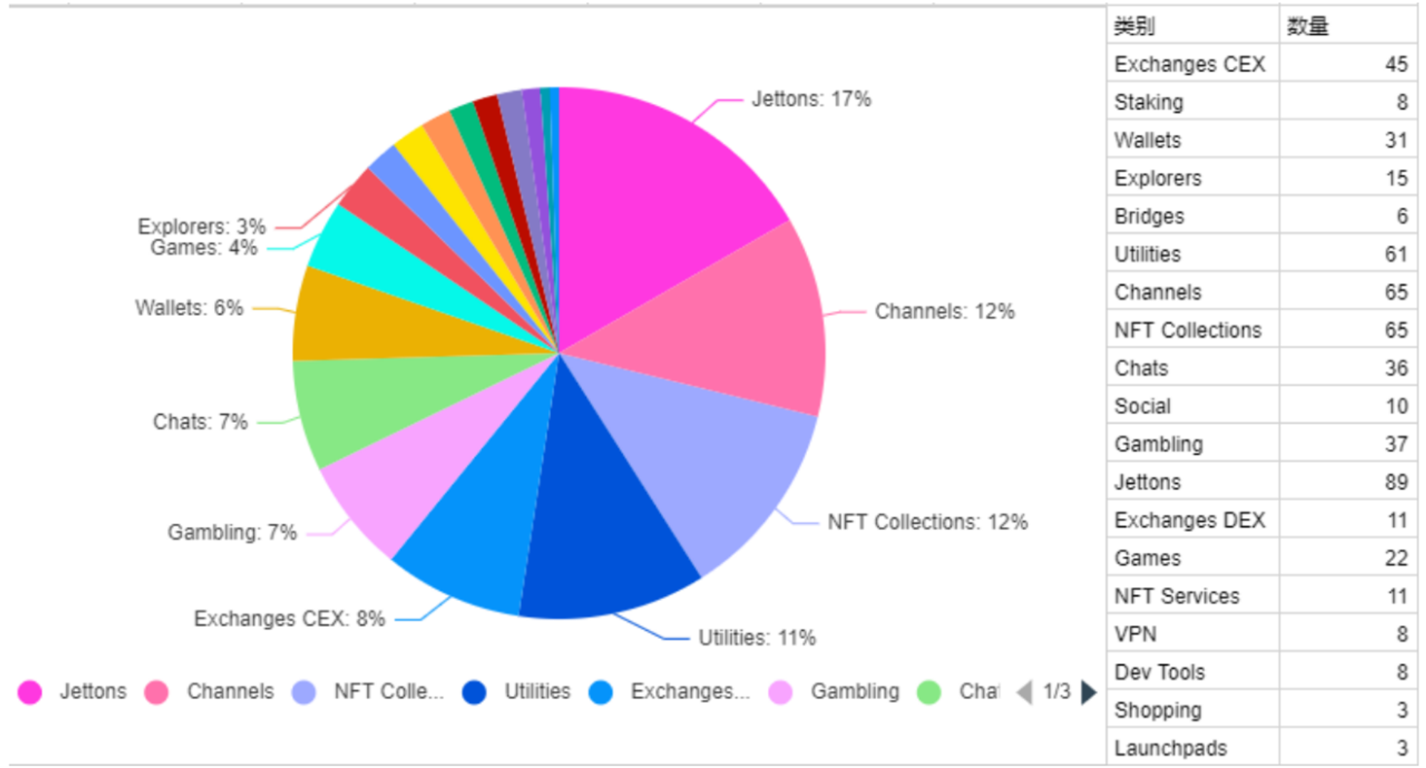 截至 去年11 月 11 日,Ton 生态共有 551 个Dapp,涵盖钱包、Defi、NFT、gaming、socialFi 等,但据 Starbase 文章中提到 TON 生态项目实际上包括了许多电报群。目前整体看来,TON生态仍处于非常早期的阶段。