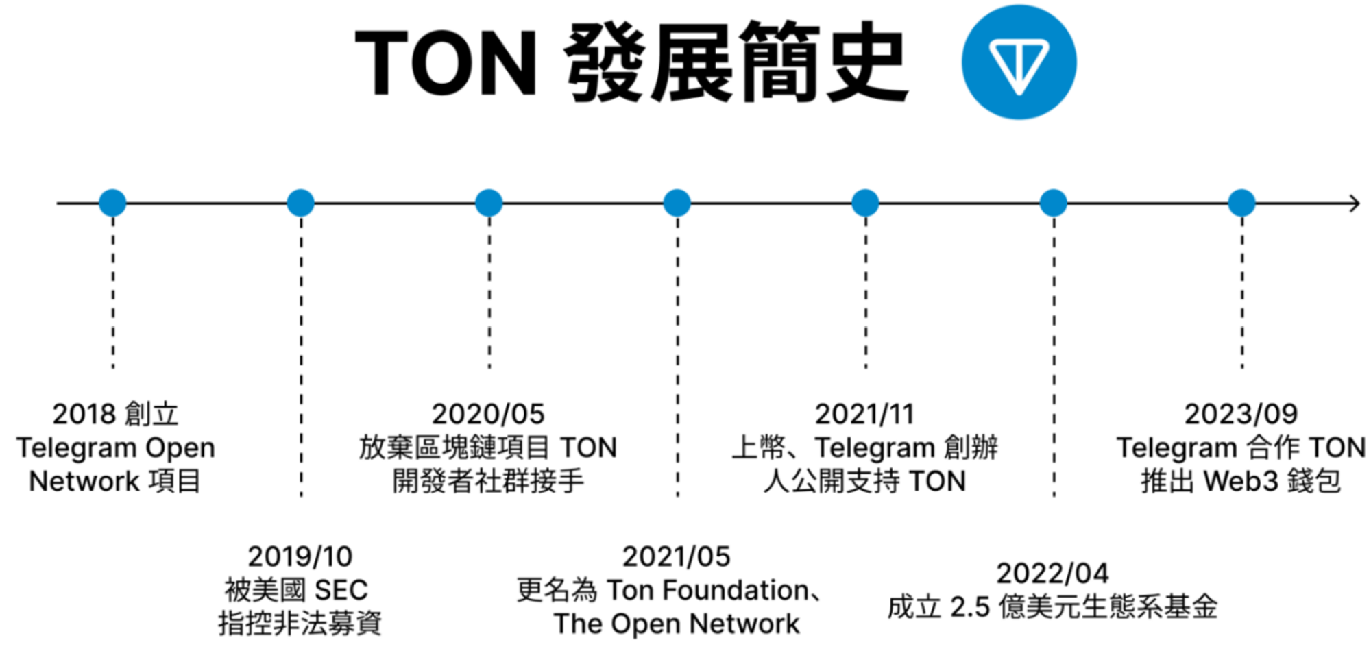 The Open Netwotk(TON) 原名 Telegram Open Network,由 Telegram 在 2018 年创建,旨在创建一个强大且可扩展的区块链平台,并通过其代币 $Grams,完成了史上最高募资金额的 ICO。由于受到 SEC 指控其进行未经注册的证券发行,2020 年 Telegram 团队在同意支付 1850 万美元的罚款与 SEC 达成和解后,放弃 Telegram Open Network 项目并将 ICO 募集的美元资金退还。