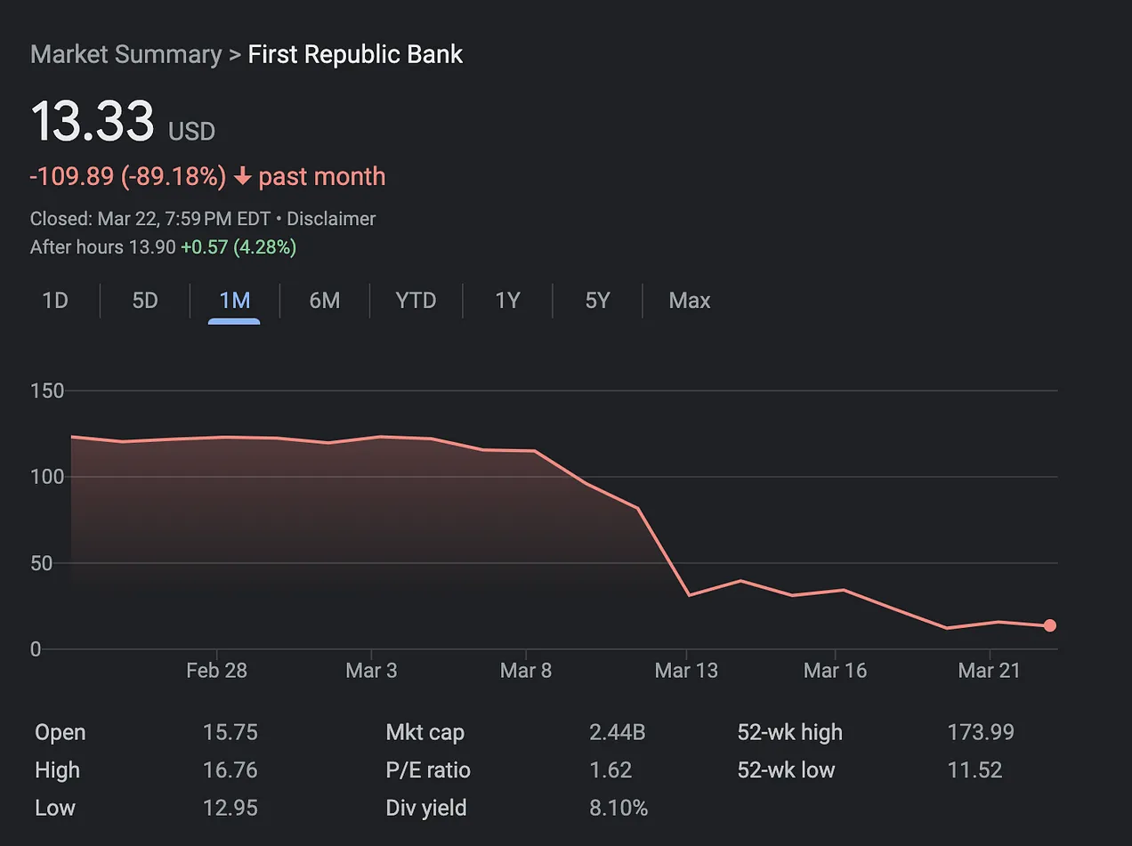 特别是,签名银行与他们的同行西太平洋或第一共和相比,受到的不同待遇非常有说服力。这两家银行的财务状况相似或更糟,但都有时间自救,而签名银行则是在周日晚上,即SVB倒闭之后被查封的。第一共和国在SVB倒闭后有时间进行融资,并获得了300亿美元的救命稻草。然而,他们的股票在过去两周内下跌了87%,他们似乎仍有可能倒闭或被收购。很明显,他们的财务状况和签名银行一样糟糕,但他们有足够的时间来解决问题。一位熟悉两家银行财务状况的银行家告诉我第一共和银行的情况:“与签名银行相比,这是双重标准——在我看来,这是毫无疑问的。”