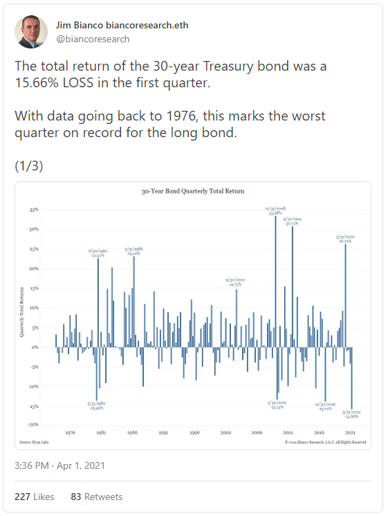 值得简要研究一下为什么这些银行一开始就陷入困境。这一点在其他地方已经得到了很好的阐述,但最终的原因很简单,可以判断出来。美国政府近年来一直在进行大规模的赤字支出,特别是在Covid和CARES法案等权宜之计的背景下,其支出水平堪比二战期间。不出所料,这种财政冲动表现为自80年代以来的最高通胀,要求美联储机械地加息,异常迅速地以使通货膨胀率回落到符合其任务规定。从数学上讲,高利率会导致债券贬值,尤其是长期债券。因此,作为金融系统基础抵押资产的政府债券投资组合,在去年的表现是有史以来最差的。美国银行持有大量此类债券,并因此集体遭受了6200亿美元的未实现的损失。