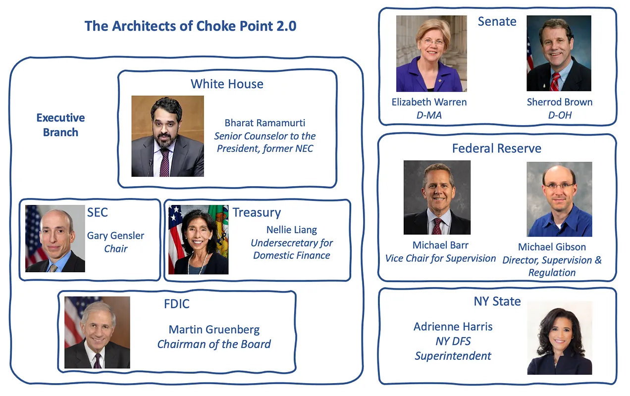 这种对合法行业的非法攻击背后的人是有名字的,他们应该受到任何关心法治、正当程序和我们金融系统完整性的人的最大程度的质疑。据我所知,协调打击的主要责任在于以下个人,他们分布在各个机构、州和国会。