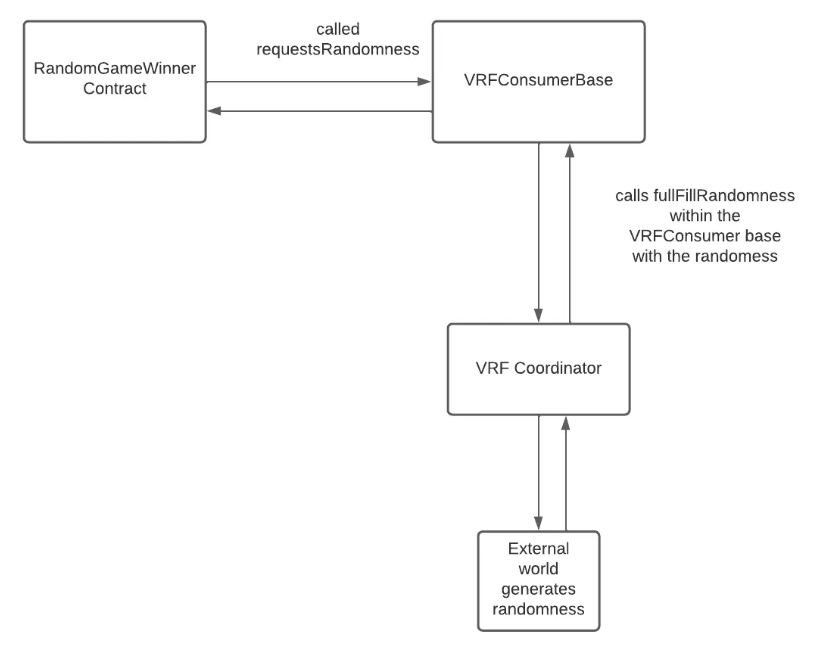 它使智能合约能够在不影响安全性或可用性的情况下访问随机性。Chainlink VRF遵循请求与接收数据的循环,其工作方式是:我们在一个交易中向oracle发送请求,而oracle在另一个交易中回应请求的数据。