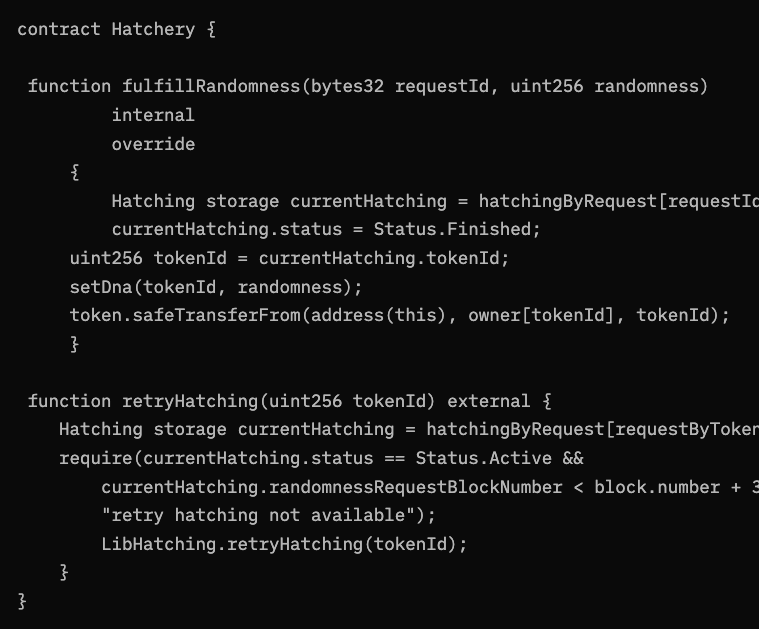 在这个例子中,用户可以将智能合约作为NFT的接收者,并且在onERC721Received中,如果代币dna不利,就会恢复交易。由于随机性重试逻辑,用户可以不断重新roll随机性,直到获得所需的dna。