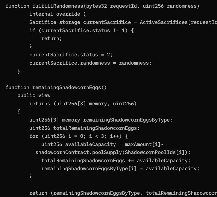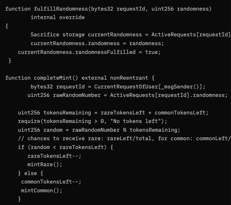 在这个例子中,随机性取决于状态变量(tokensRemaining),这意味着当其他用户调用completeMint时,用户的随机性会发生变化;因此,用户可以等到随机性有利的时候,再提交completeMint交易。