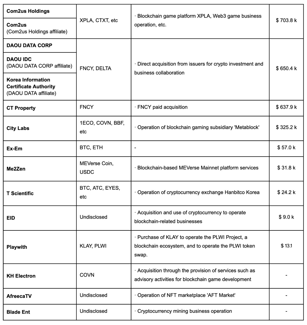 据证实,私营公司也收购并持有虚拟资产,并通过年度审计报告透明披露。主要是Dunamu、Bithumb、Coinone、Cobit、Gopax(Streamy)等经营虚拟资产交易业务的公司。此外,也有企业通过在Gurobal Games、XL Games等游戏平台上登录Web3游戏而获得一定数量的加密货币。Uprise等加密货币投资公司持有加密货币作为投资资产,如比特币或以太坊。即使在私营公司中,加密资产也主要由运营或计划运营加密相关业务的公司持有,例如游戏公司、投资公司和IT相关公司。此外,即使他们不直接经营加密货币相关业务,也存在通过参与Klaytn和XPLA主网验证者来获取加密货币的情况。