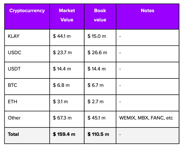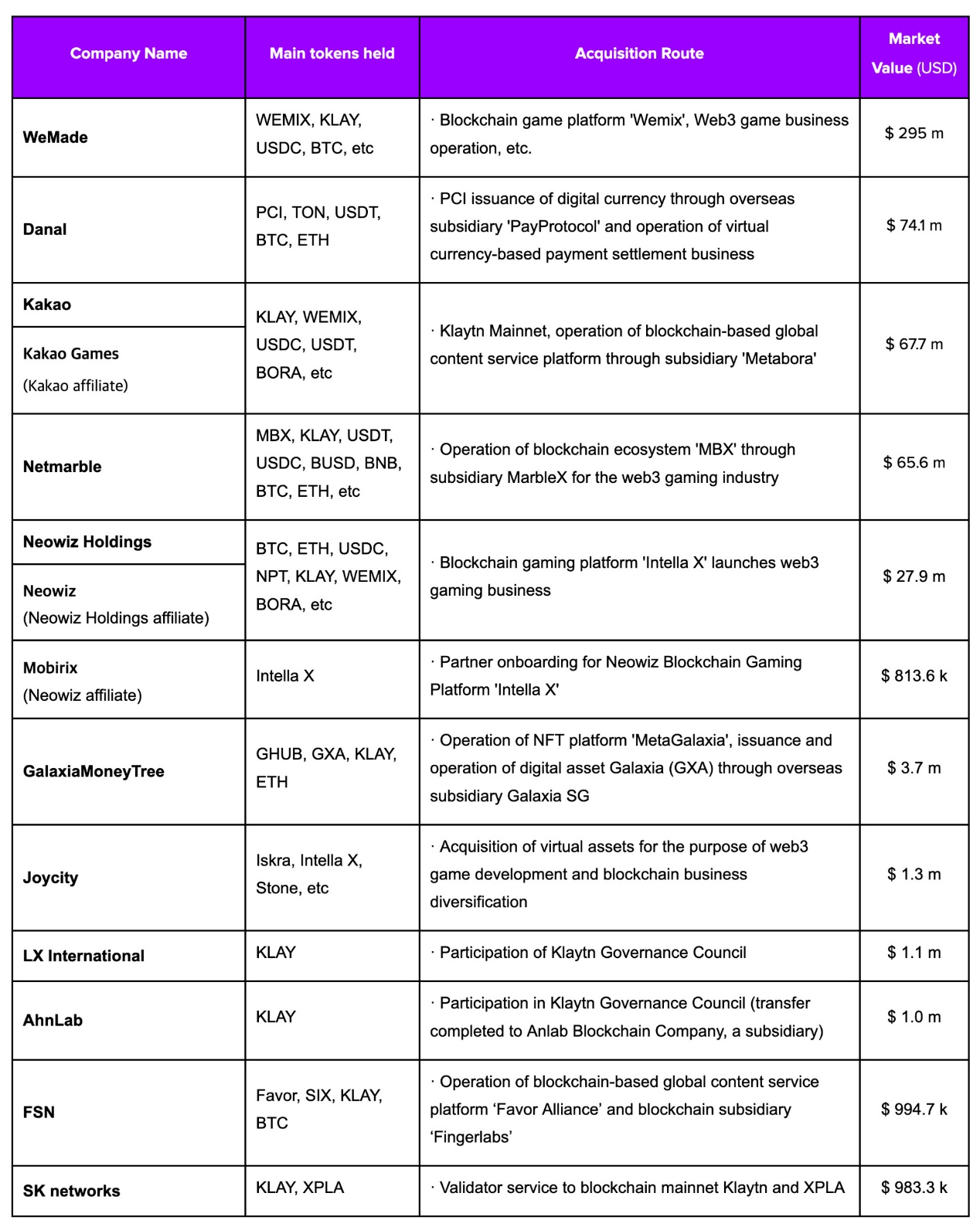 1.他们直接发行或购买加密货币来开展自己的区块链业务,主要在韩国发行的WEMIX、BORA、NEOPIN等区块链游戏相关的加密货币持有量占比最大。